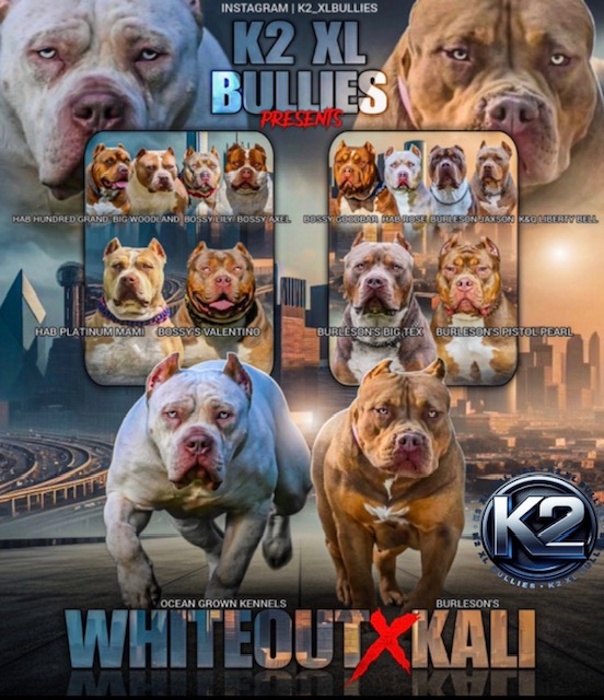 At K2 XL Bullies, we are excited to announce our upcoming Whiteout and Kali breeding for Oct 2025.
